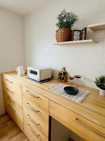 無垢材の床や木目を活かした家具は、触れたときのやわらかさも魅力です。家事や育児の合間に、ふっと力が抜けるような心地よさがあります。